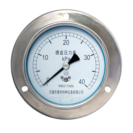 YE-100轴向带边膜盒压力表适用于测量无爆炸危险、不结晶、不凝固,以及对铜和铜合金无腐蚀作用的液体、气体或蒸汽的低微压力。